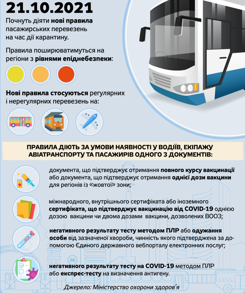 С 21 октября вступили в силу новые правила межрегиональных перевозок по всей Украине. Перевозки пассажиров на поездах и автобусах в другие области возможны при условии наличия у всех водителей и пассажиров COVID-сертификатов, отрицательных результатов ПЦР-тестов или тестов на антиген.
