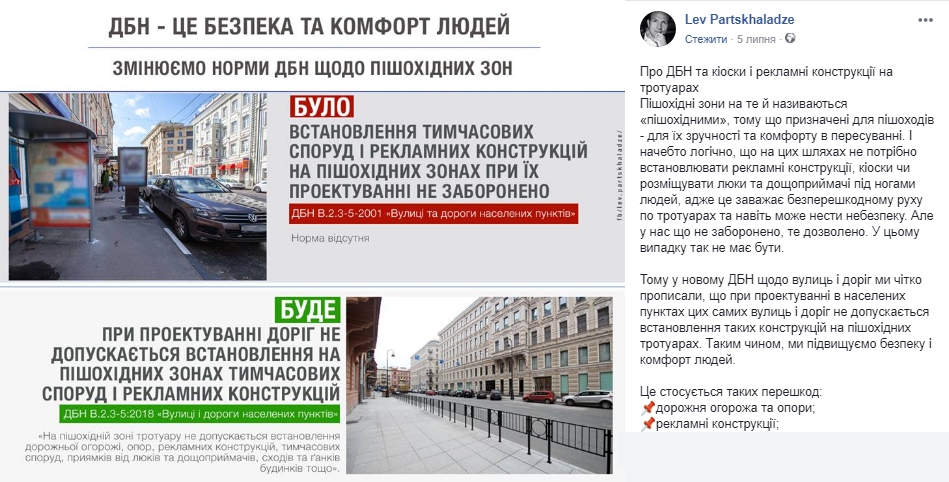 06 июля 2018 Заместитель министра регионального развития, строительства и жилищно-коммунального хозяйства Лев Парцхаладзе, сообщил, что в Украине вводят запрет на установку временных сооружений, рекламных и других конструкций на пешеходных зонах тротуаров при проектировании и реконструкции улиц.