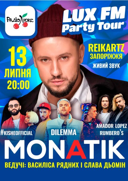 Что будет? Грандиозная вечеринка в отеле “Рейкарц” уже в эту пятницу. Вечеринка пройдет под открытым небом, главным гвоздём программы станет украинский певец Monatik. Ведущими вечера станут Василиса Рядных и Слава Демин (звезды эфира Люкс-ФМ). Также на концерте выступят исполнители Amador Lopez и группа Rumberos, Kishe, Dilemma.