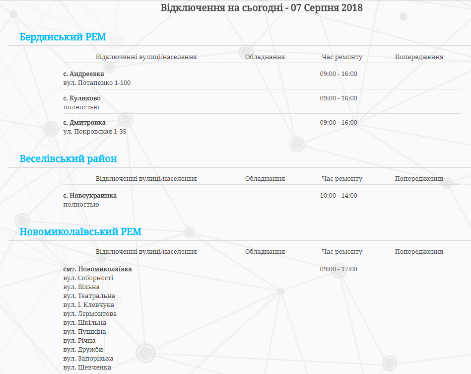 В “Запорожьеоблэнерго” сообщили, что отключение произошло в Бердянском, Веселовском и Новониколаевском районах.