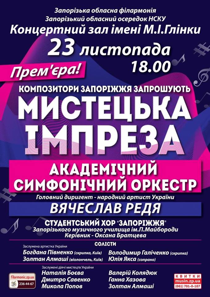 Что: Концерт академического симфонического оркестра. Главный дирижер – народный артист Украины Вячеслав Редя. Прозвучат премьерные произведения известных композиторов: заслуженных деятелей искусств Украины Натальи Боевой, Дмитрия Савенко, Николая Попова и Валерия Колядюк.