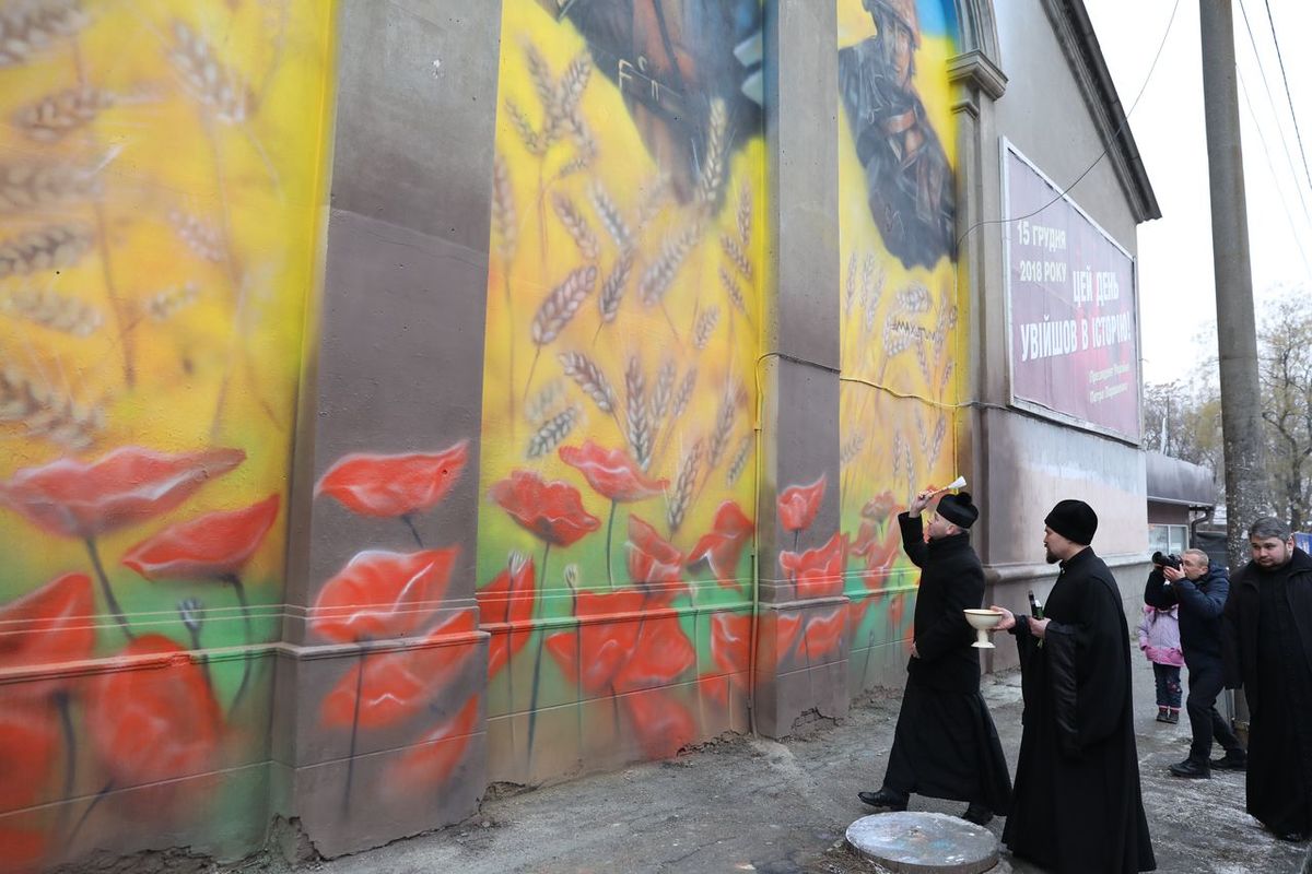 Патриотический мурал открыли в честь 100-летия Украинской Революции. На мурале изображены трое защитников Украины.