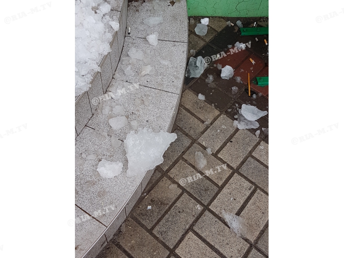 В мелитопольском отделении “ПриватБанка” произошло ЧП. Огромная сосулька сорвалась с крыши и пробила козырек у входа в финучреждение.