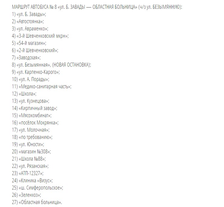 Вчера такую петицию зарегистрировали в электронном реестре петиций Запорожья. Инициатор – Виталий Бесчастный – предлагает запустить в городе новый автобусный маршрут № 8 «ул. Б. Завады — Областная больница» (через улицу Безымянную) и добавить остановку «ул. Безымянная».