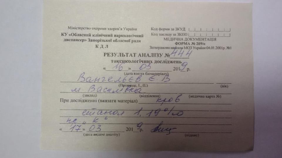 По словам журналиста, на утро справку о том, что прокурор находился в алкогольном опьянении выдали, но в ней не значилось количество промилле в крови. Полиция пришлось сопроводить медработников с пробами в Запорожье, где их анализ провели в областном наркологическом диспансере и выдали результат, который указывал степень опьянения.