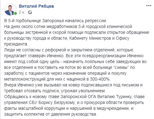 По словам депутата от “Батькивщины” Виталия Рябцева, главврач способствует процветанию коррупции в больнице и подвергает репрессиям несогласных работников. Вопрос отстранения главврача рассматривать отказались, но обращение коллектива пятой городской больницы включили в повестку дня. Также поступило предложение пригласить в зал главврача и задать ему накопившиеся вопросы.