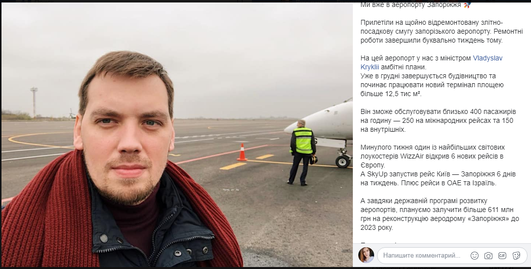 Гончарук пишет, что на этот аэропорт у него с министром инфраструктуры Владиславом Криклий амбициозные планы: