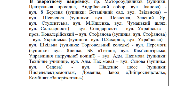 Маршрут №56 «Комбинат« Запорожсталь»- Центральная проходная» хотят организовать таким образом: ул. Южное шоссе, ул. Седова, ул. Адм. Нахимова, ул. Победы, ул. Школьная, ул. Украинская, ул. Стефанова, пер. Кавалерийский, ул. Украинская, ул. Солидарности, ул. Шевченко, ул. 8 Марта, пр. Моторостроителей.
