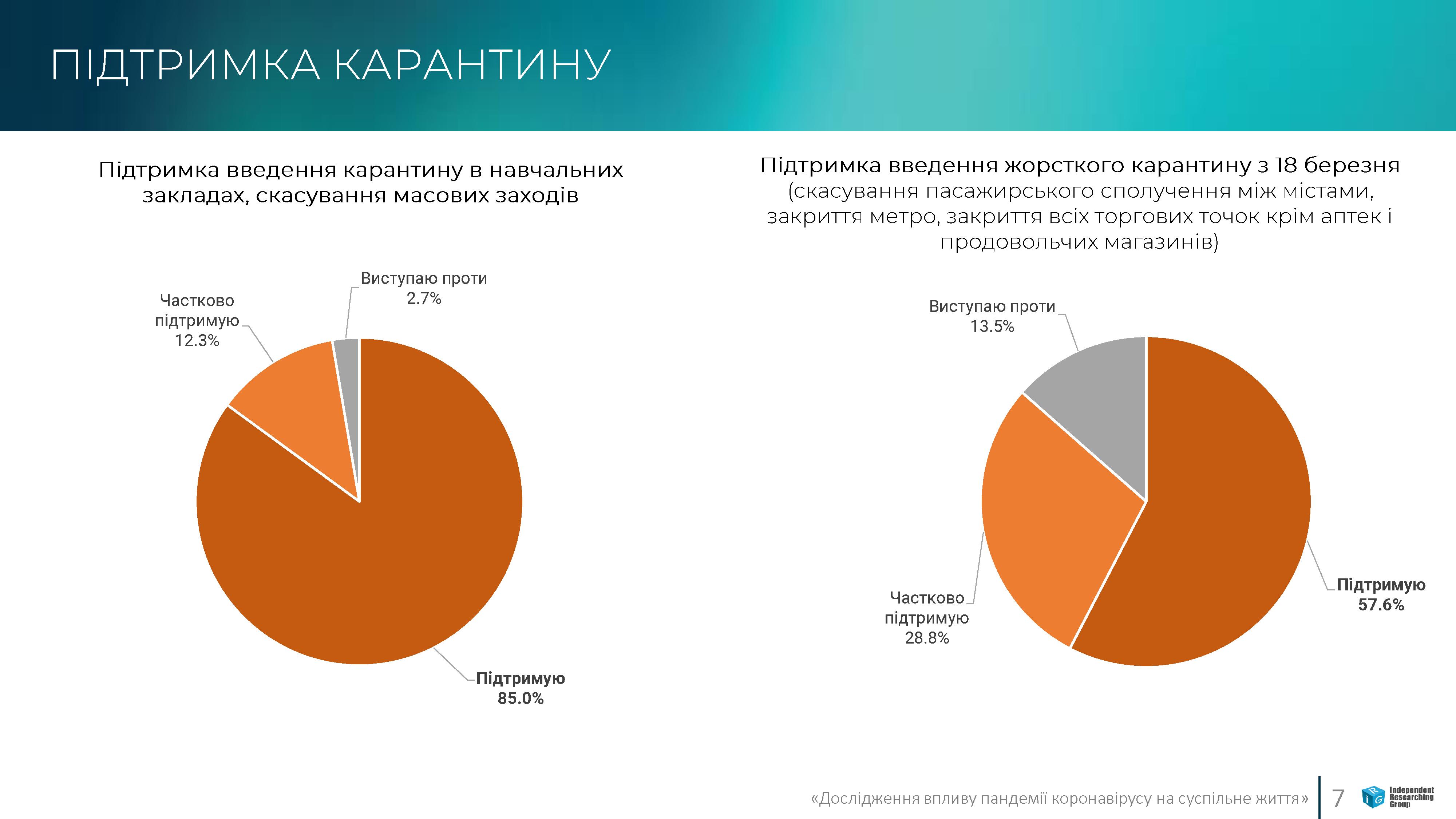 Карантинные меры поддерживает абсолютное большинство жителей страны (больше 85%). При этом ужесточение мер, таких как запрет межрегионального транспорта и закрытие торгово-развлекательных центров поддерживает только 58% жителей Украины.