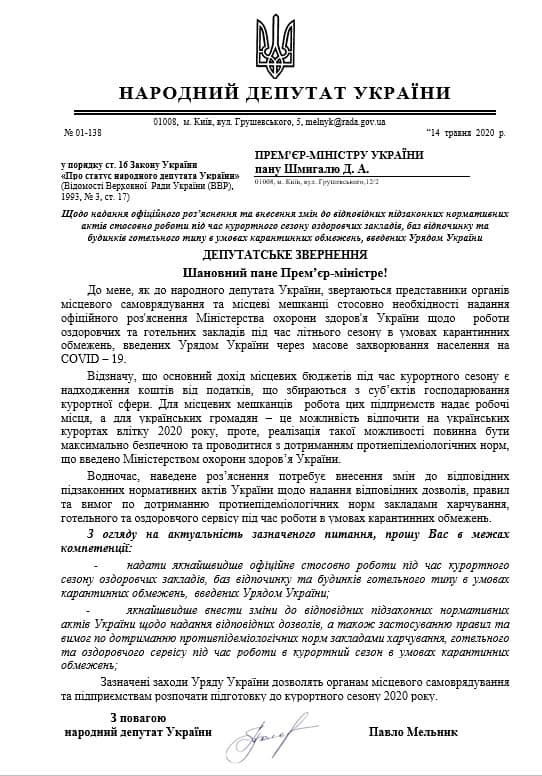 Я обратился к Премьер-министру Украины с официальным обращением по скорейшему предоставлению таких официальных разъяснений и внесения соответствующих изменений в подзаконные нормативные акты (правила, разрешения и требования) по соблюдению противоэпидемических норм заведениями питания, гостиничного и оздоровительного сервиса во время работы в условиях карантина. Старт курортного сезона должен быть своевременным, а отдых украинских граждан максимально безопасным, – прокомментировал Павел Мельник.