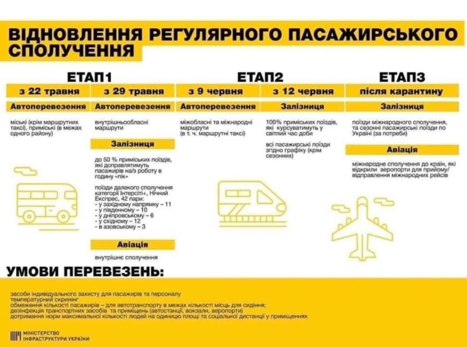 Затем, с 29 мая, могут возобновить внутриобластные автобусные маршруты; до 50% пригородных поездов; движение поездов дальнего сообщения категорий “Интерсити+”, “Ночной экспресс” (всего 42 пары); внутреннее авиационное сообщение.