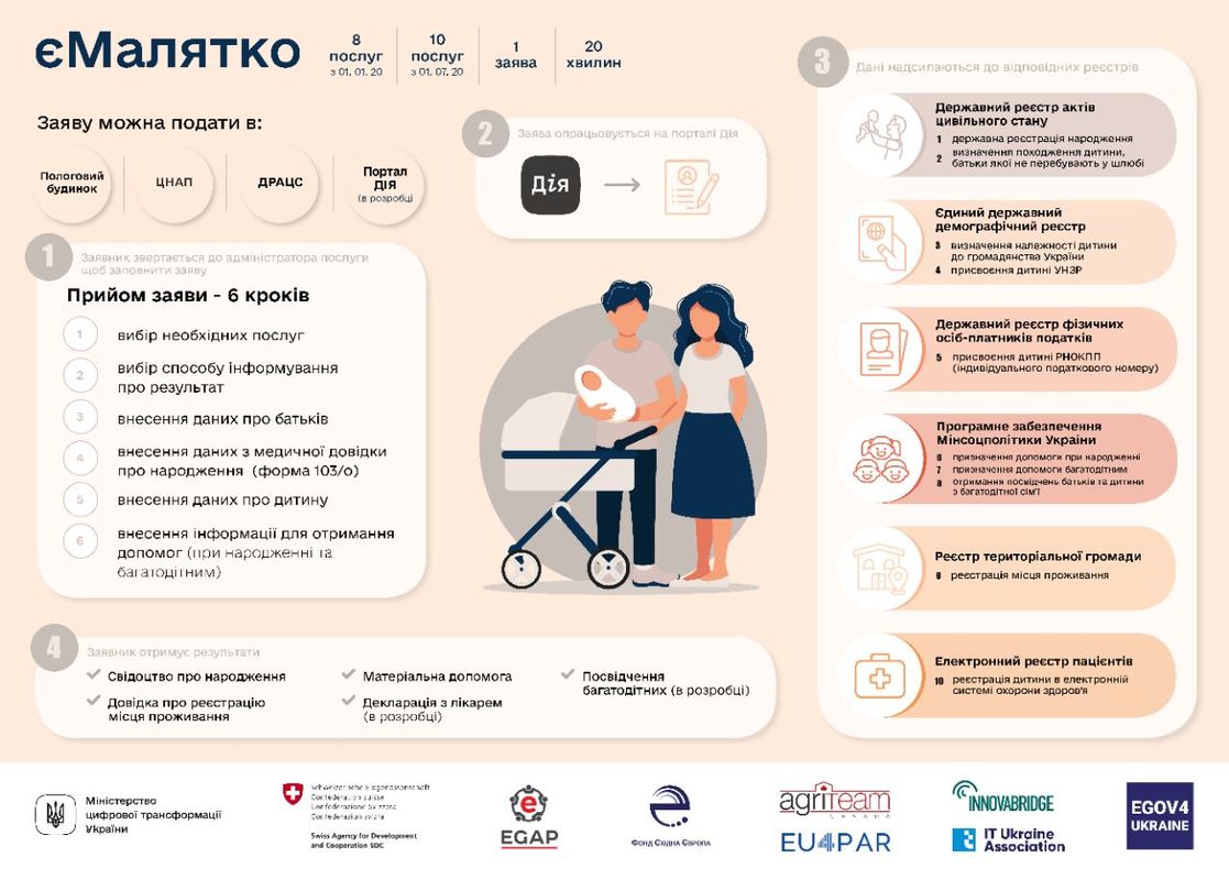 В Запорожье сервис “еМалятко” введен в 16 заведениях. Это комплексная услуга для родителей новорожденных, которая предполагает объединение 10 услуг по одному заявлению.