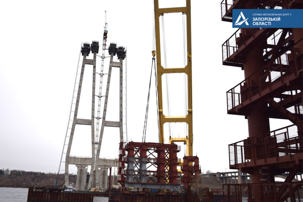 Строители при помощи плавкрана “Захарий” смонтировали вторую временную опору вантового моста. Он соединит левый берег Запорожья с островом Хортица.