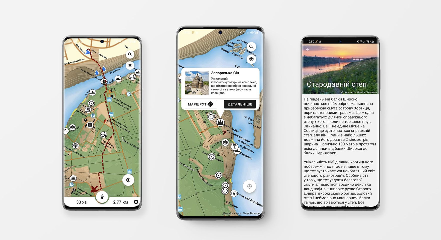 В приложении собраны более 100 объектов с интересными рассказами и фото. Пешеходные, велосипедные и автомобильные маршруты между любыми точками, все объекты туристической и транспортной инфраструктуры Хортице, навигация и многое другое.