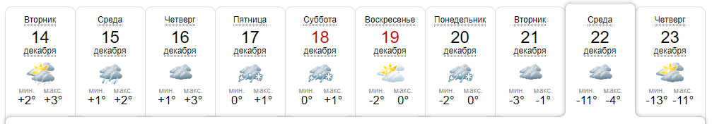 А вот 23 декабря температура и ночью, и днём будет больше 11 градусов мороза.