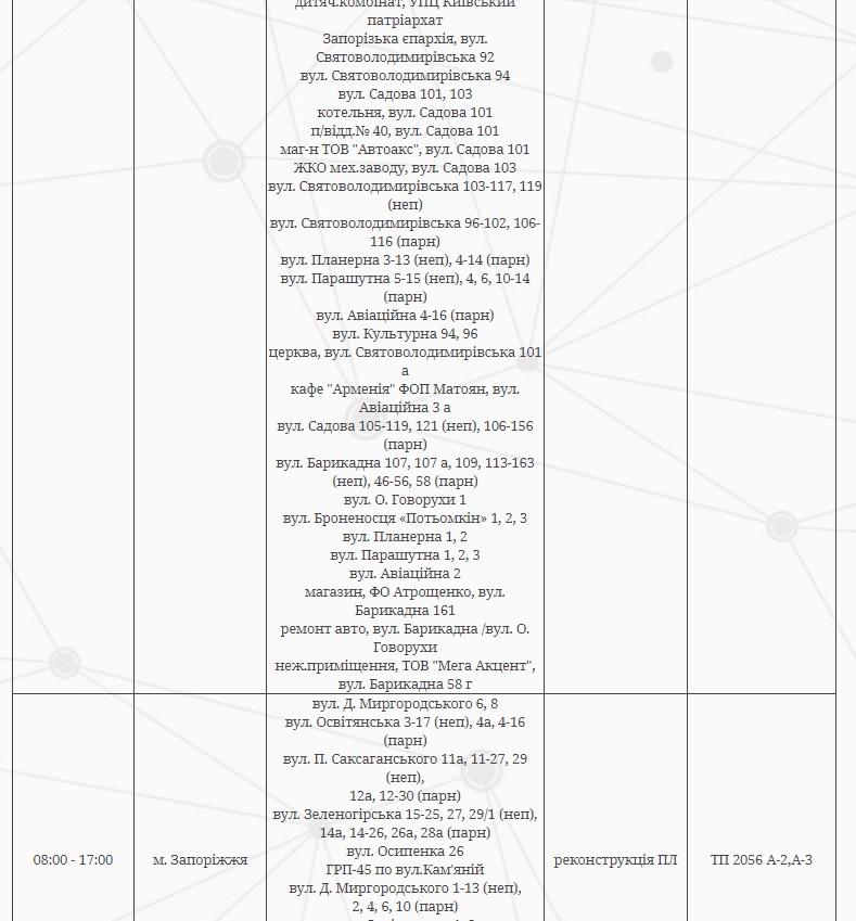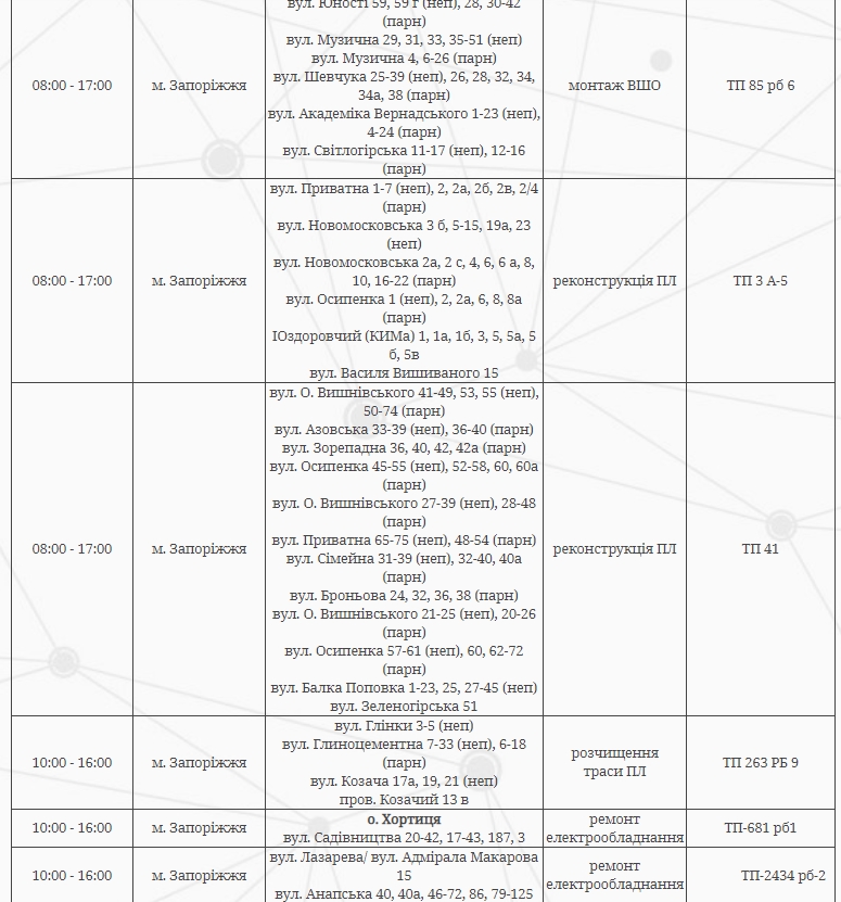 В Запорожье сегодня в нескольких районах не будет света. Специалисты “Запорожьеоблэнерго” будут проводить ремонтные работы на линиях электропередач.