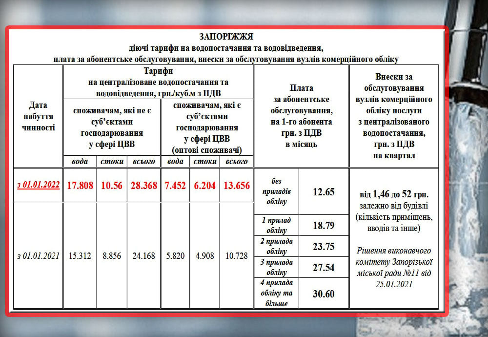 Новые тарифы на воду в Запорожье (население)