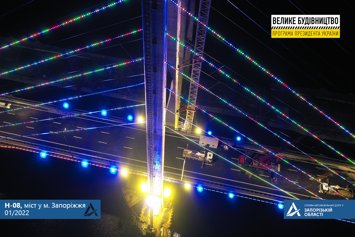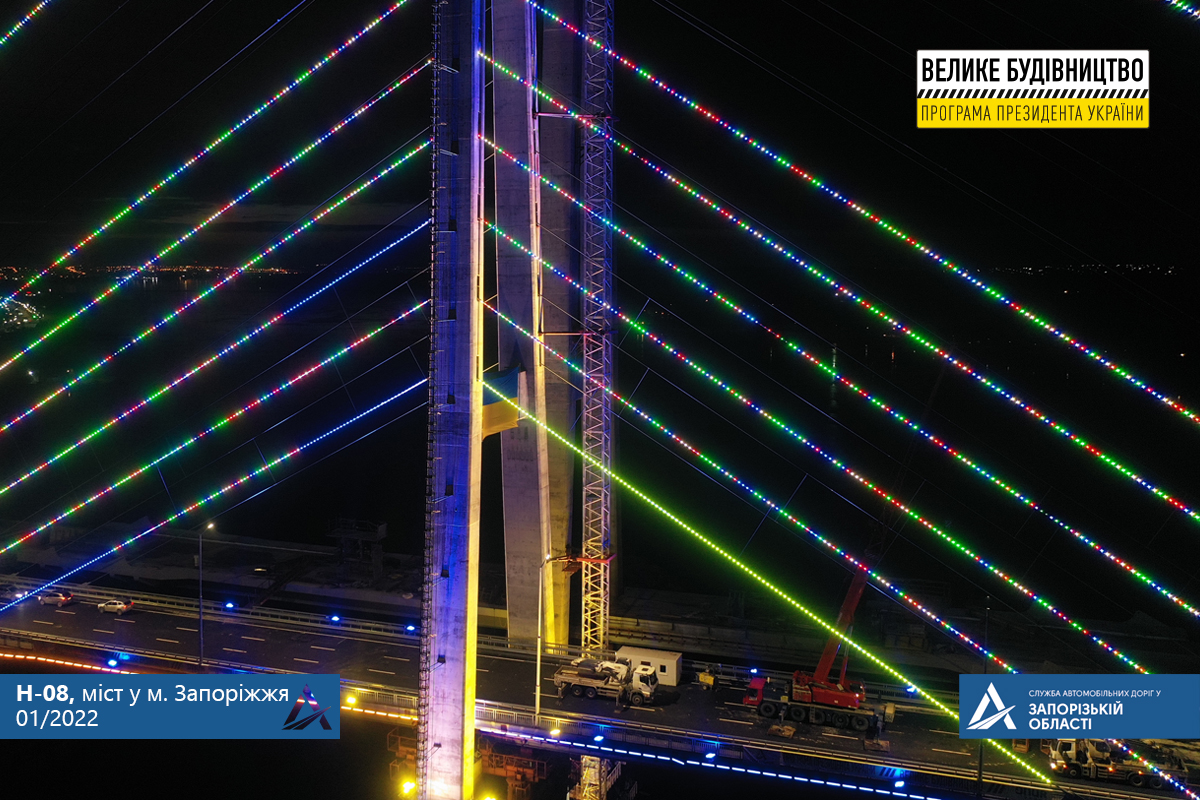 Стальные канаты вантового моста и сами пилоны украшены LED-подсветкой. Её включают в тёмное время суток в Запорожье.