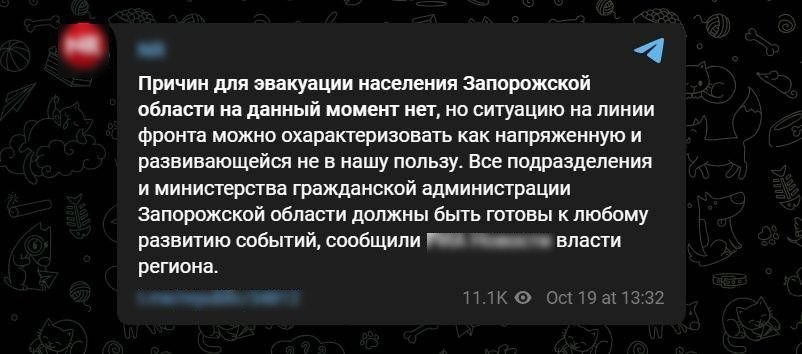 В российских телеграмм-канал распространяется паника, по поводу того, как у оккупантов идут дела на фронте в Запорожской области.