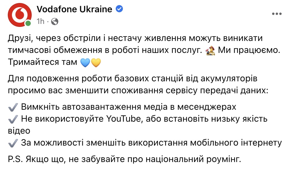 Мобильный оператор Vodafone предупреждает о возможных перебоях со связью из-обстрелов оккупантов и нехваткой электропитания.