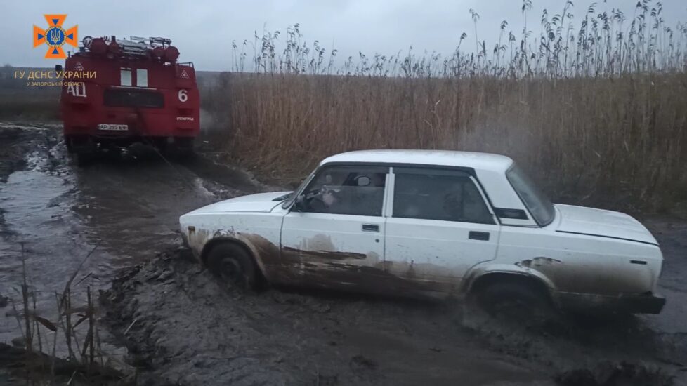 Из-за погодных условий на дорогах Запорожской области продолжают застревать машины. Очередные автомобили спасатели вытащили в селе Каменское.