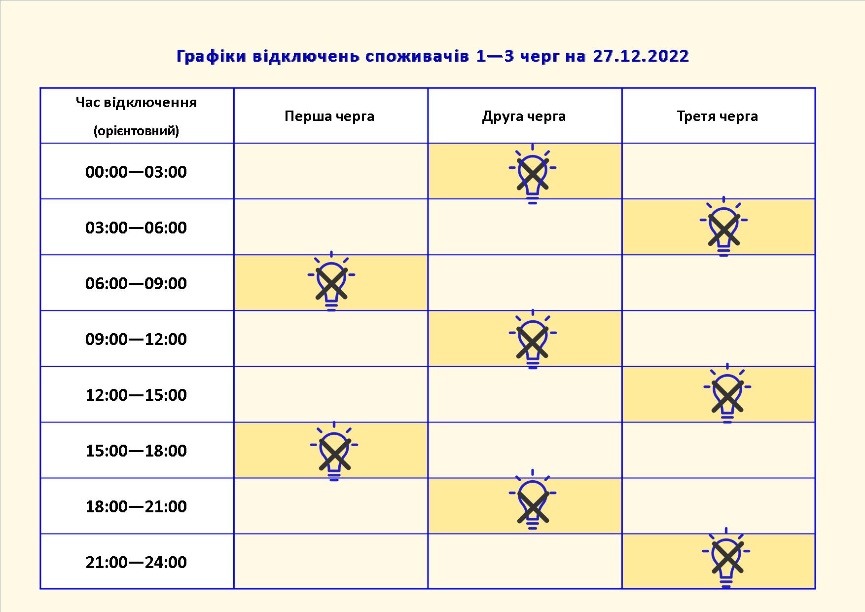 27 декабря в Запорожье действуют графики почасовых стабилизационных отключений электроэнергии.