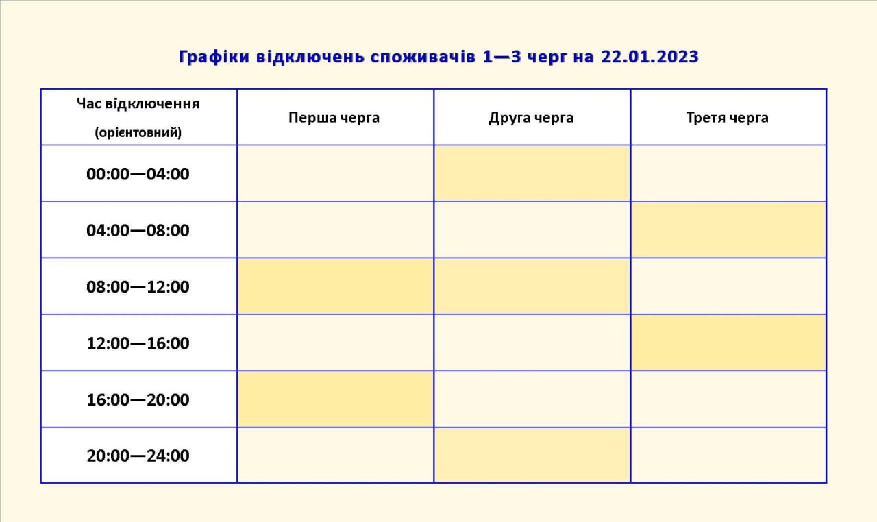 Лимит, доведенный НЭК «Укрэнерго» для Запорожской области на ночное и дневное время 22.01.2023, аналогичен сегодняшнему, так что почасовые стабилизационные отключения будут продолжаться по такой же схеме.