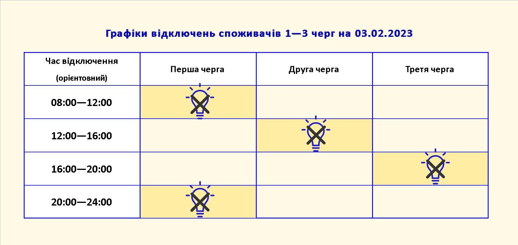 3 февраля в Запорожье отключения начались в 08:00 с первой очереди. По графику почасовые отключения для каждой из очередей будут продолжаться по 4 часа. Возможна задержка в случае объявления воздушной тревоги.