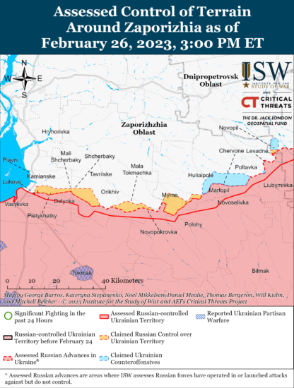 В Институте изучения войны показали, где проходит линия фронта в Запорожской области. На карте представлена последняя обновленная информация о ситуации в Украине на 27 февраля.