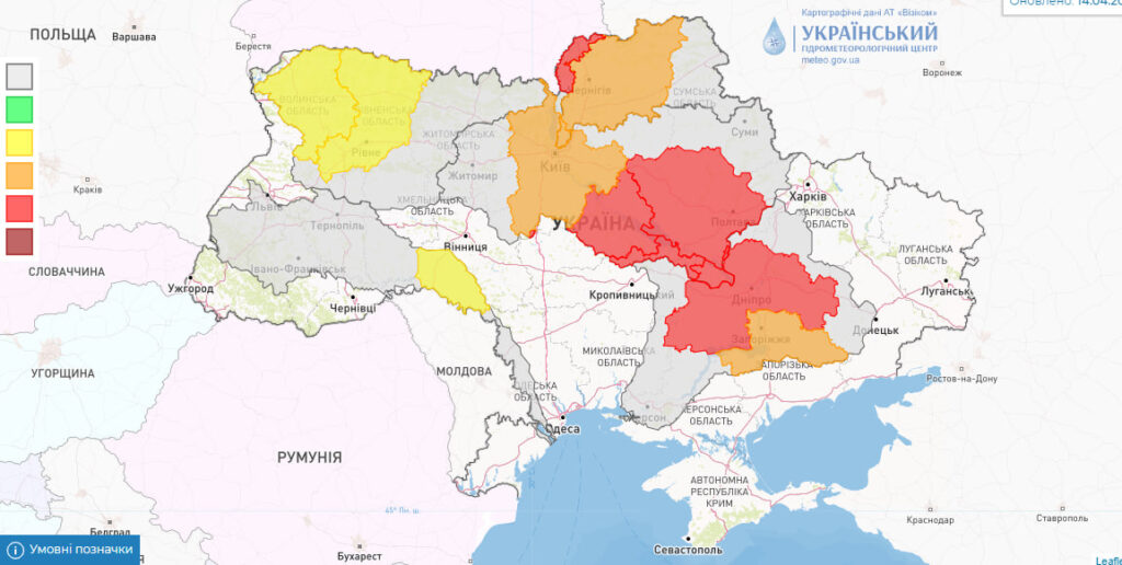 14-17 апреля есть угроза значительных сбросов воды при пропуске весеннего половодья через водохранилища Днепровского каскада. Под водой могут оказаться ряд населенных пунктов в Запорожской области (II уровень опасности – оранжевый) вдоль Каховского водохранилища.