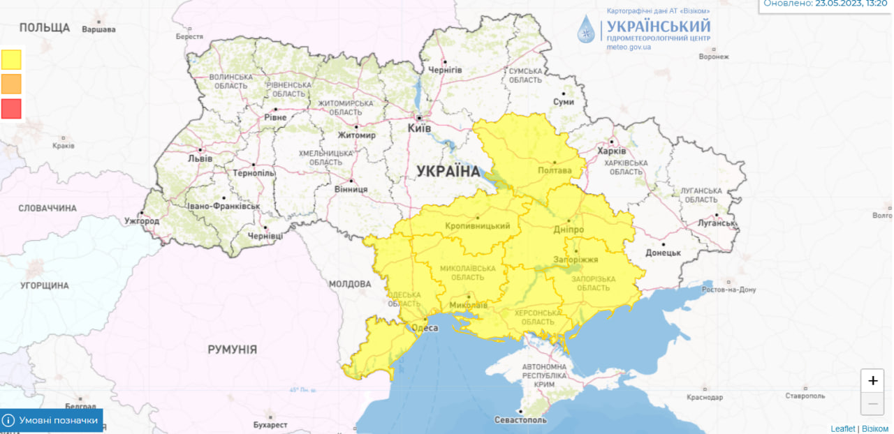 Уровень опасности “желтый” объявили в Полтавской; Кировоградской; Днепропетровской; Одесской; Николаевской; Херсонской; Запорожской области.
