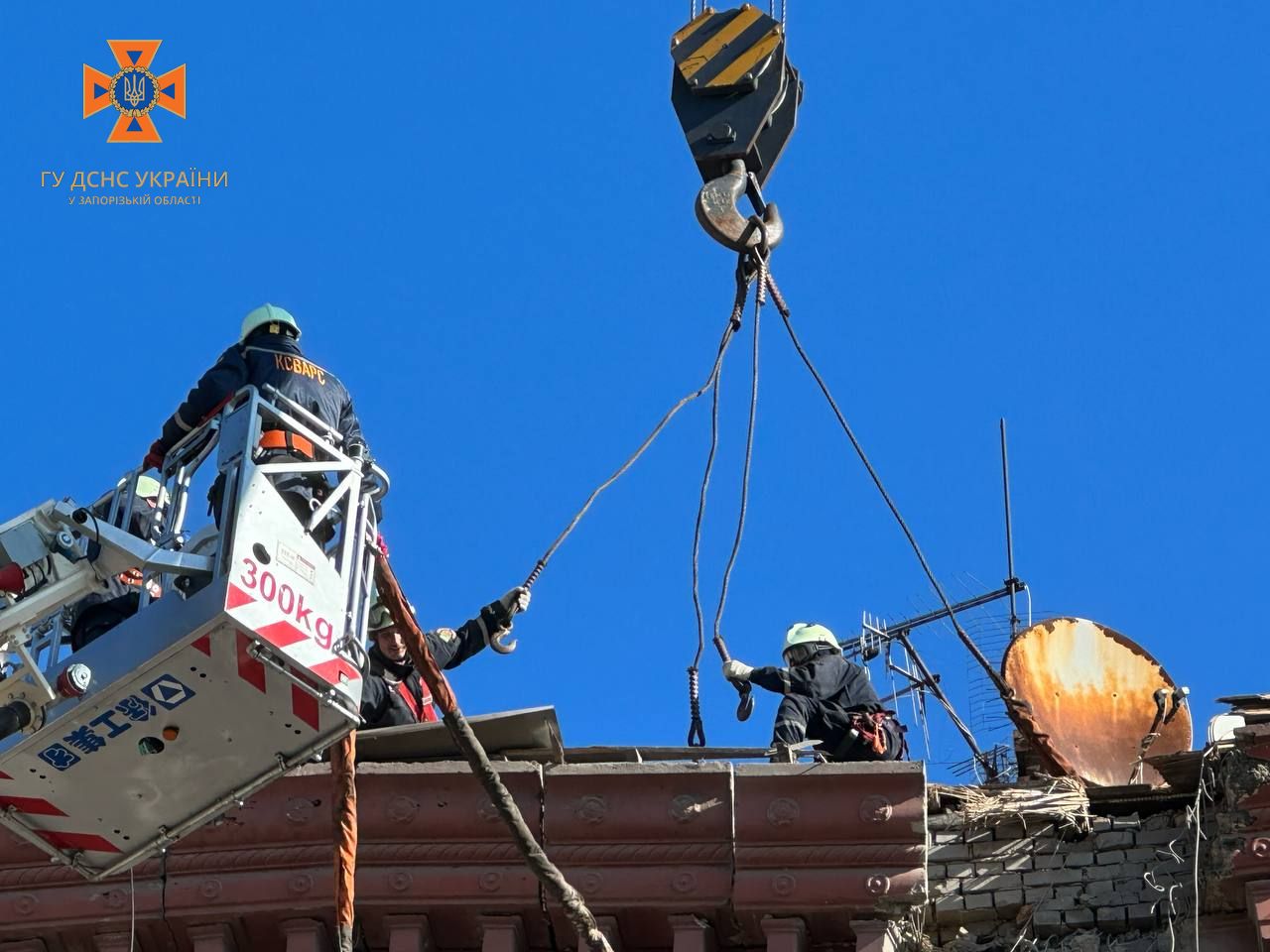 В Запорожье продолжают вести поисковые и аварийно-спасательные работы в доме, который разрушен в результате ночной атаки по Запорожью.