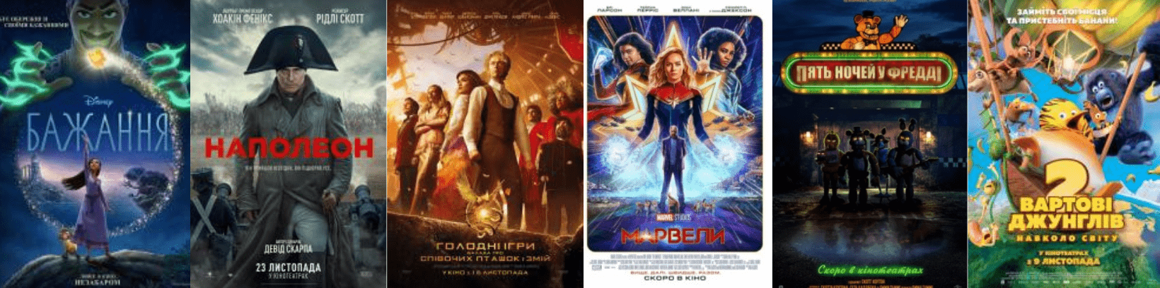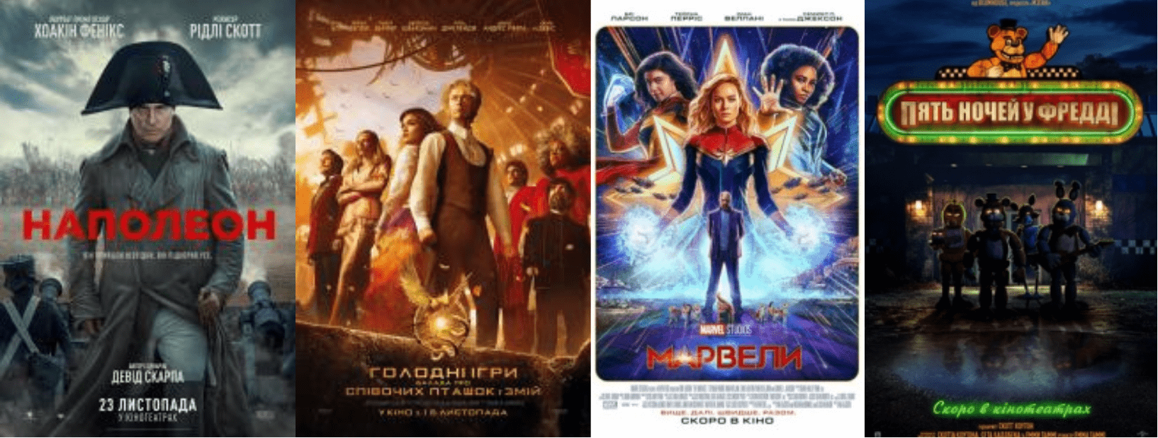 Для запорожцев в прокате доступны пять фильмов: “Желание”, “Наполеон”, “Голодные игры: Баллада о певчих птицах и змеях”, “Марвелы” и “Пять ночей у Фредди”.