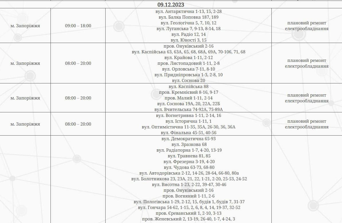 В Запорожье по некоторым адресам сегодня будут отключать электроэнергию. Это связано с плановыми ремонтными работами.