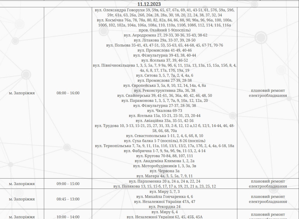 В Запорожье по некоторым адресам сегодня будут отключать электроэнергию. Это связано с плановыми ремонтными работами.