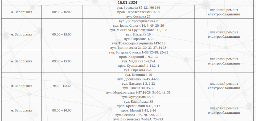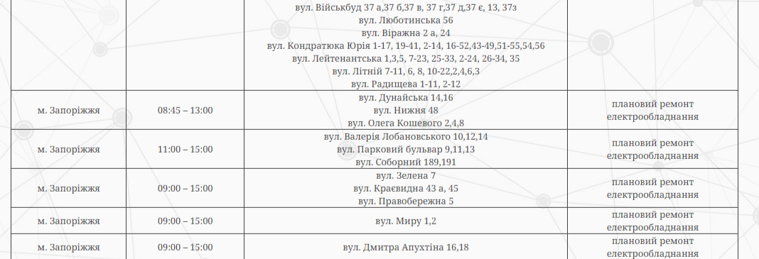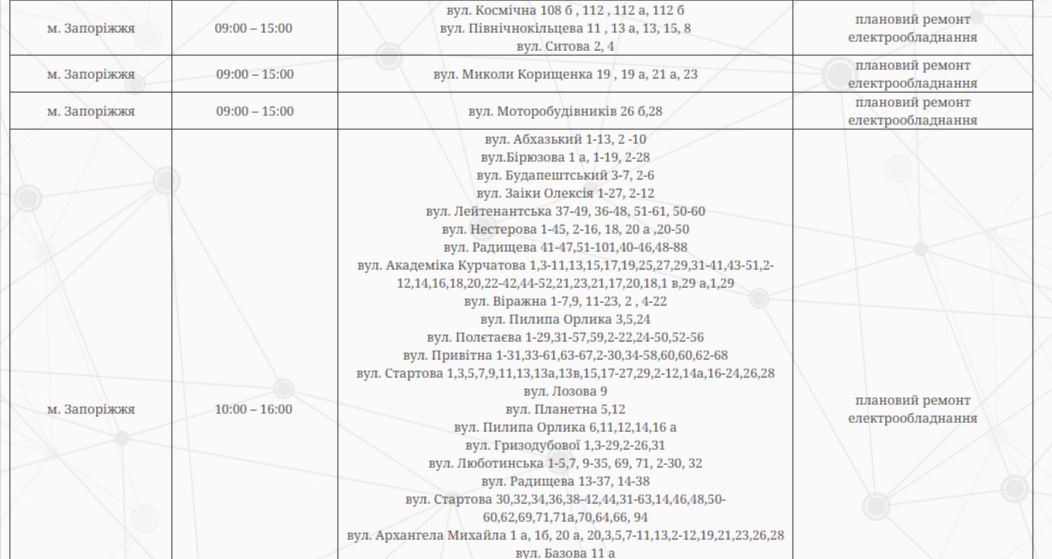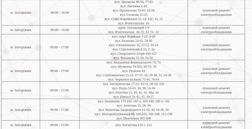 В Запорожье по некоторым адресам сегодня будут отключать электроэнергию. Это связано с плановыми ремонтными работами.