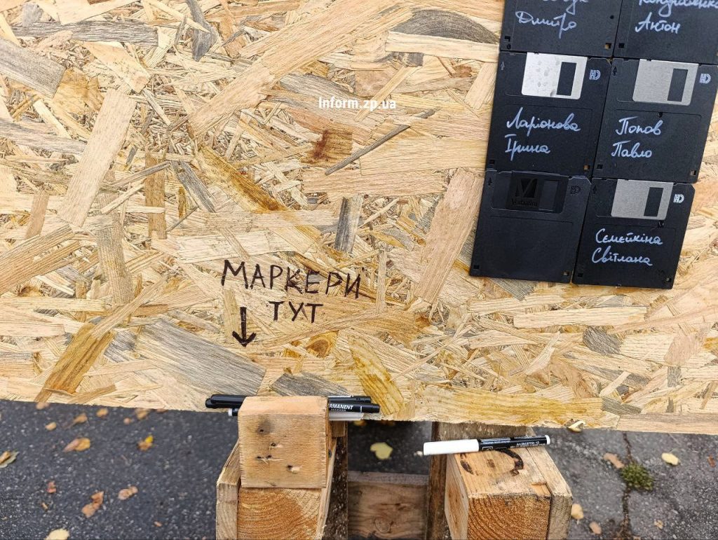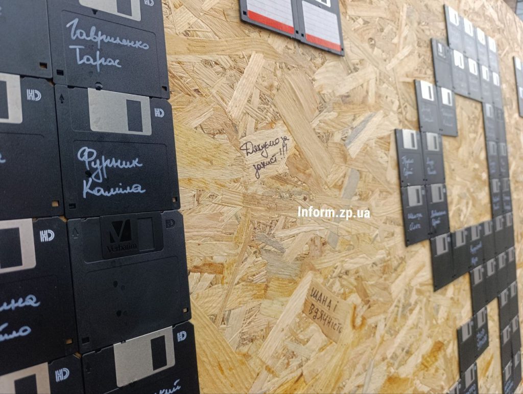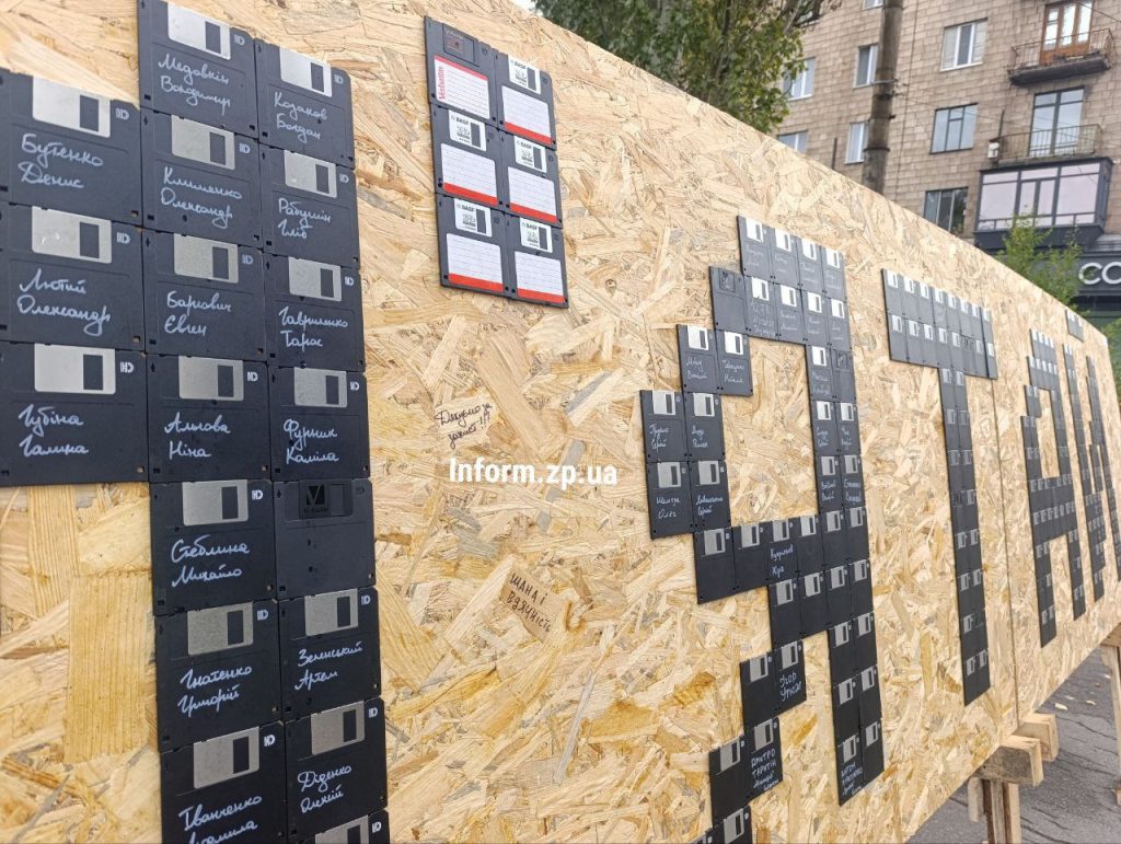 Элементы инсталляции сделаны из дискет, символизирующих память. На них написаны имена погибших военных и гражданских из Запорожья и области. К проекту присоединились и прохожие, они вписывали имена тех, кого потеряли во время войны.