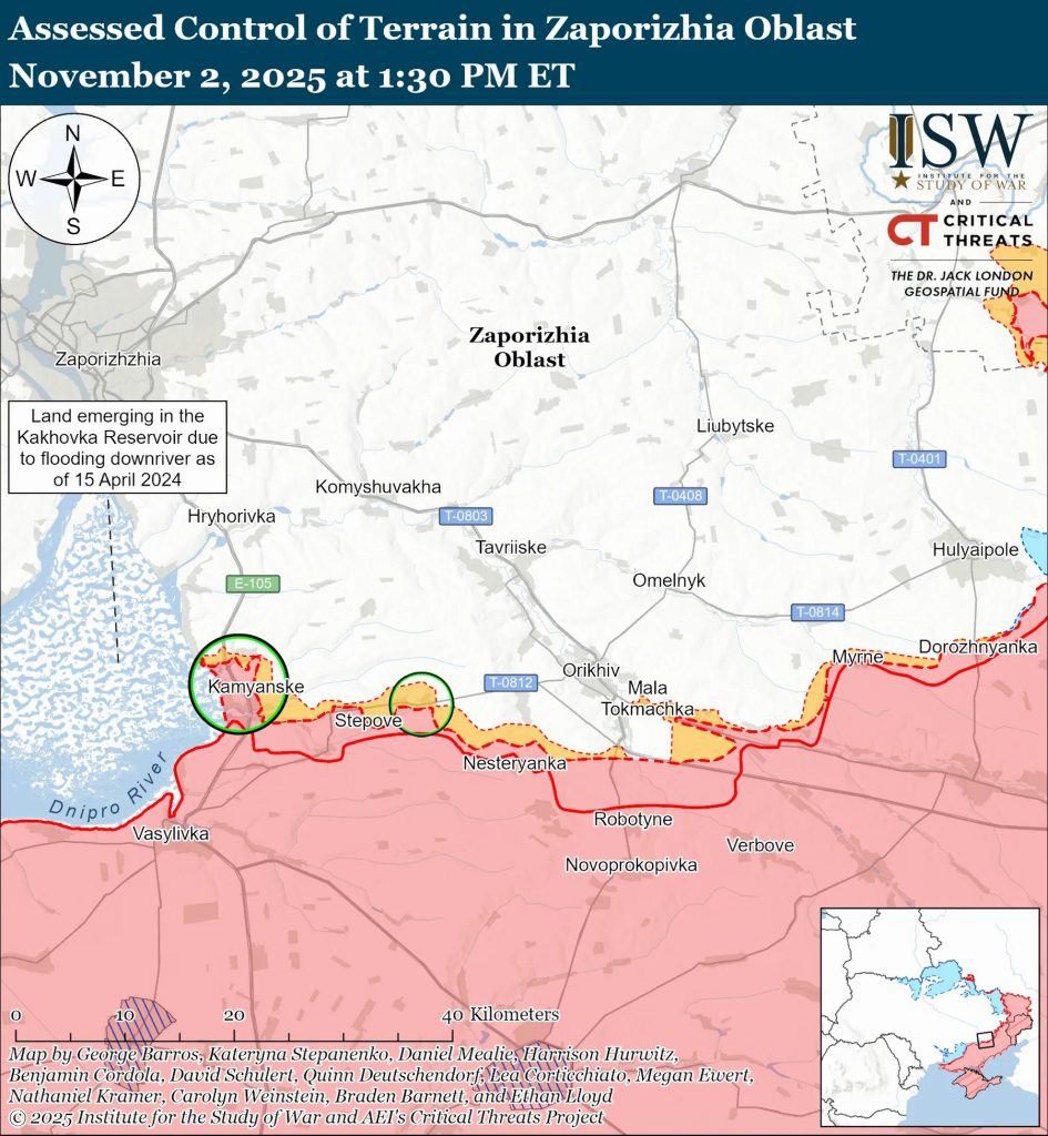 Также 2 ноября российские войска продолжили штурмовые действия на западе Запорожской области вблизи Щербаков, Каменского, Приморского и Степногорска, однако и здесь линия фронта осталась стабильной.