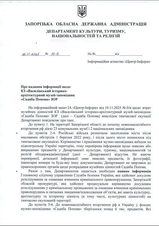 В Департаменте культуры, туризма, национальностей и религий указали, что не обращались в правоохранительные органы относительно фактов разграбления музейных ценностей “Усадьбы Попова”, поскольку руководство и сотрудники музея выехали на подконтрольную Украине территорию, а проверить информацию о возможном похищении сейчас невозможно.