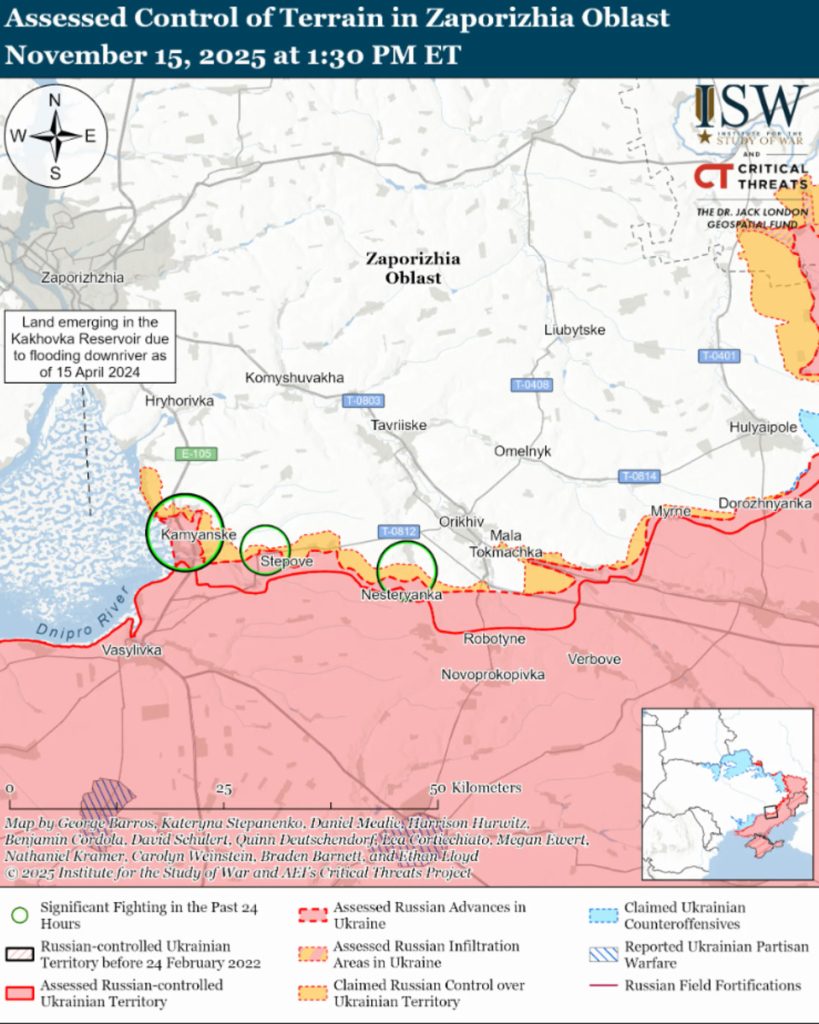 Активные боевые действия фиксируют вдоль всей линии вокруг Гуляйполя: от Варваровки на северо-западе до Зеленой Рощи на востоке. На Ореховском отрезке в течение 14-15 ноября российские войска штурмовали позиции у Малой Токмачки, Новоданиловки, Новоандреевки и нескольких сел вблизи Степногорска.