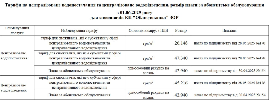 Город Запорожье не входит в зону обслуживания «Облводоканала». В городском водоканале подают такой тариф для населения: 28,37 гривны.