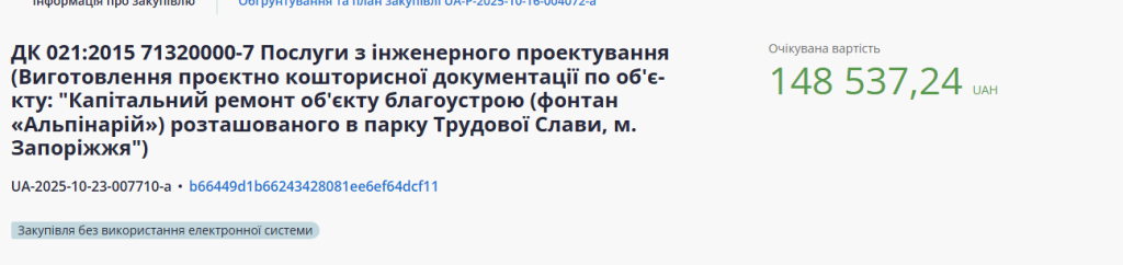 Фонтан расположен в парке Трудовой Славы. Стоимость работ составляет 148 537,24 грн, победительницей тендера стала БЕЗРУЧКО АЛЁНА АНАТОЛЬЕВНА. Работы должны быть выполнены до 31 декабря 2025 года.