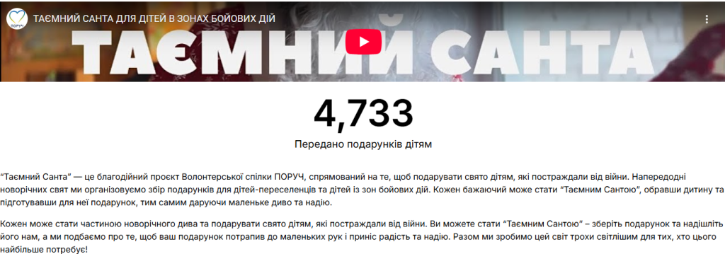 Благотворительный фонд «ПОРУЧ» ежегодно организует собственного «Тайного Санта» для детей из прифронтовых общин, в том числе для маленьких запорожцев. Волонтеры собирают детские пожелания на платформе secret-santa.poruch.org.ua, где каждый желающий может «свернуть» письмо и приобрести желанный подарок.