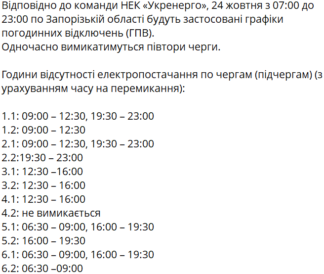 В Запорожской области 24 октября отключения были относительно короткими – в большинстве очередей по два раза продолжительностью от двух до трех часов. Часть подочередей вообще не выключалась, а самые длинные паузы фиксировались утром и вечером.