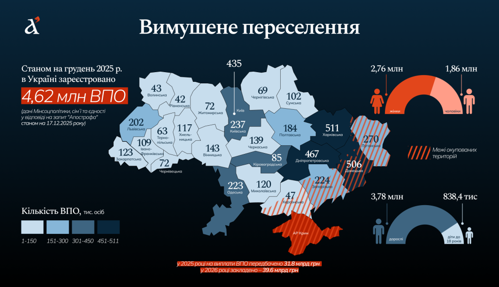 В целом по Украине среди внутренне перемещённых лиц преобладают женщины — 2,76 млн, тогда как мужчин зарегистрировано 1,86 млн. Большинство ВПЛ — взрослые старше 18 лет (3,78 млн), ещё 837,4 тыс. составляют дети.