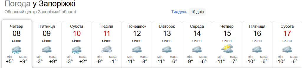 - Суббота, 10 января: температура от –3° до +9°, утро без осадков, днем и вечером облачно, возможен сильный дождь.
