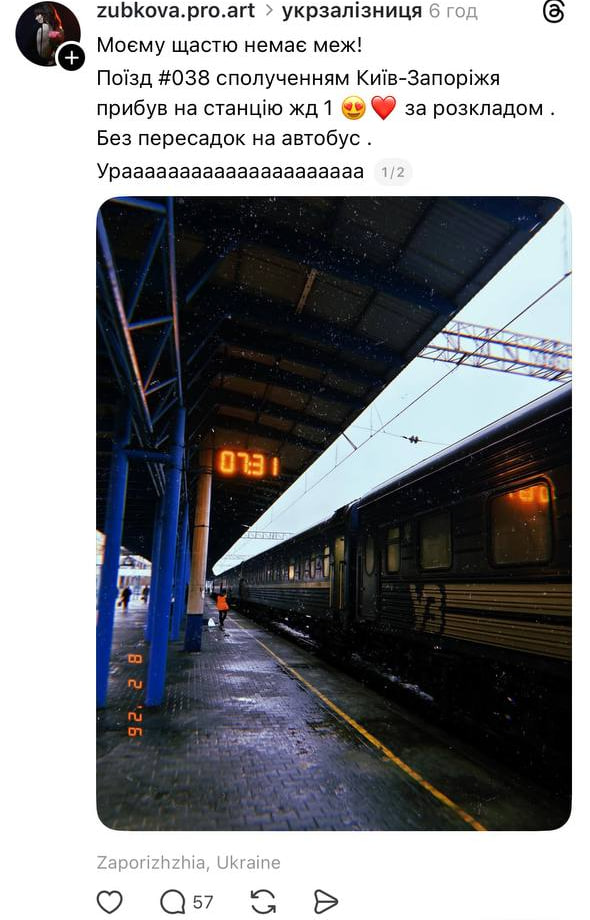 Сегодня, 9 февраля, в Запорожье впервые за последнюю неделю прибыл пассажирский поезд без пересадок и автобусных трансферов. Речь идет о рейсе №038 сообщением Киев — Запорожье, который добрался до конечной станции в штатном режиме.