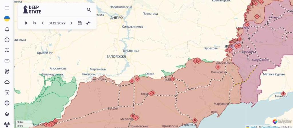 К концу декабря 2022 года ситуация изменилась. В результате контрнаступления украинские военные оттеснили оккупантов от окраин Гуляйполя и Орехова. Враг был вынужден укрепить оборону – на карте видны линии окопов, фортификационные сооружения и минные заграждения.