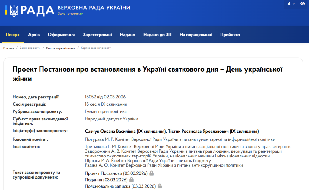«До сих пор на государственном уровне определён выходным днём 8 марта — так называемый “Международный женский день”, установленный оккупационным московским режимом с целью популяризации собственного взгляда на роль и место женщин», — говорится в пояснительной записке.