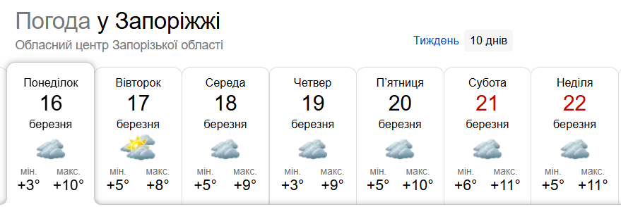 По данным Sinoptik.ua, самыми тёплыми днями будут 21 и 22 марта (суббота и воскресенье), когда максимальная температура достигнет +11°.